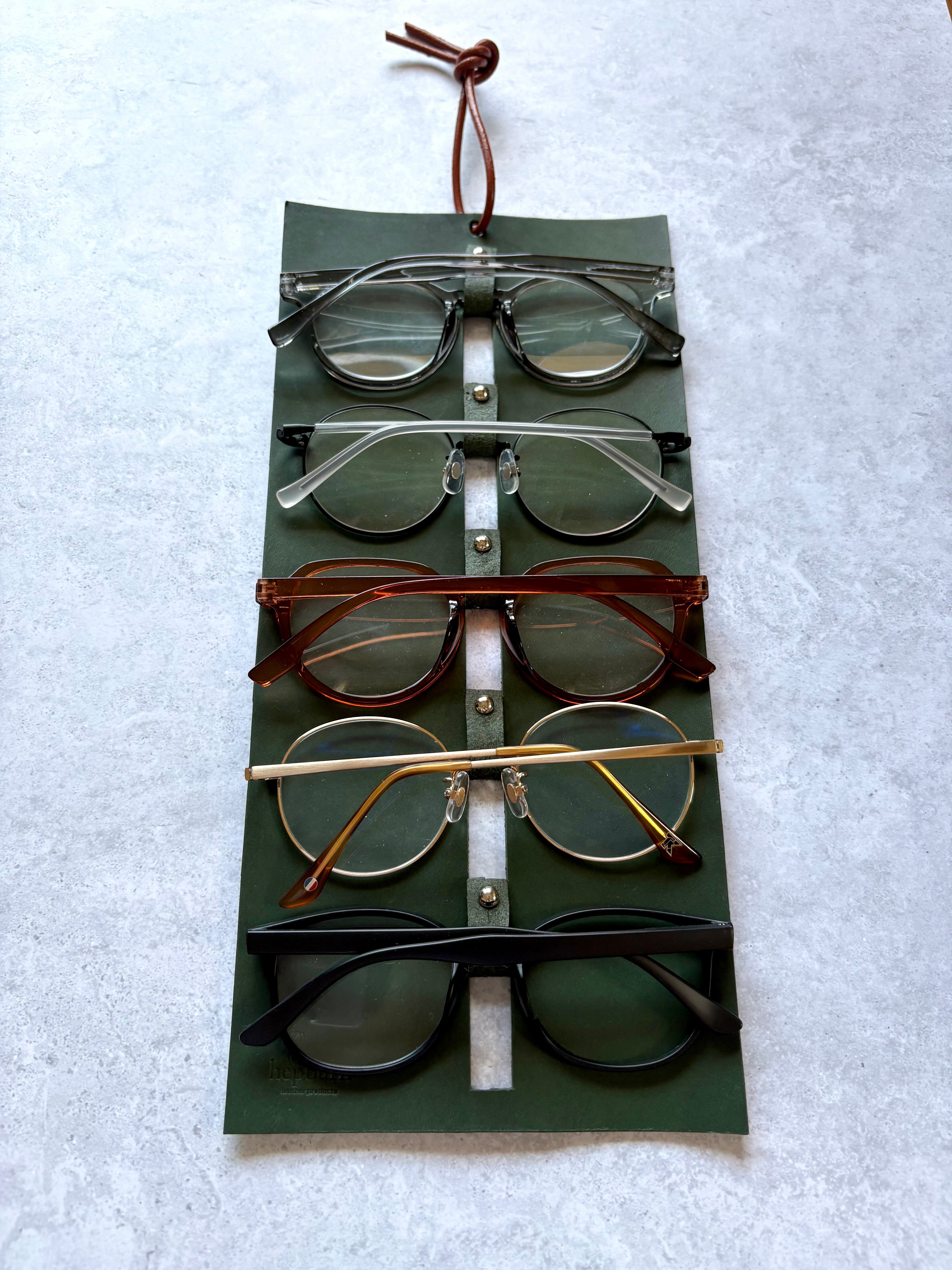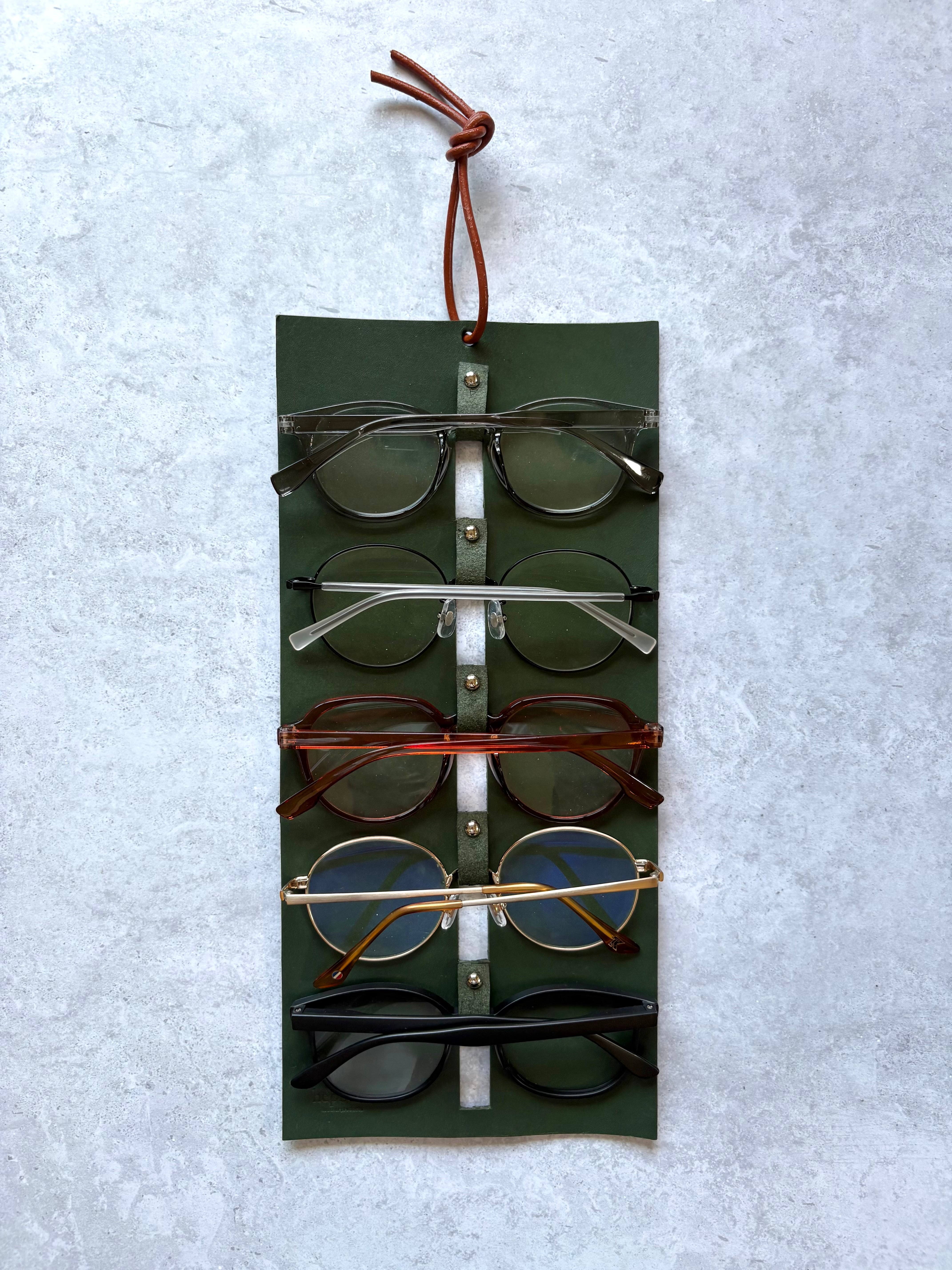 壁に掛けて、すっきりと収納できる本革のメガネホルダーです。